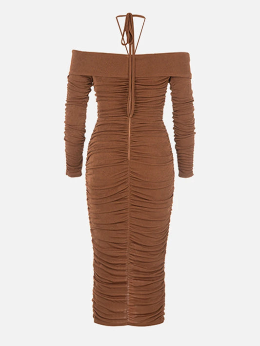 Solid Slimming Patchwork Folds Sexy Dresses For Women Halter Long Sleeve High Waist Bodycon Dress Female Fashion