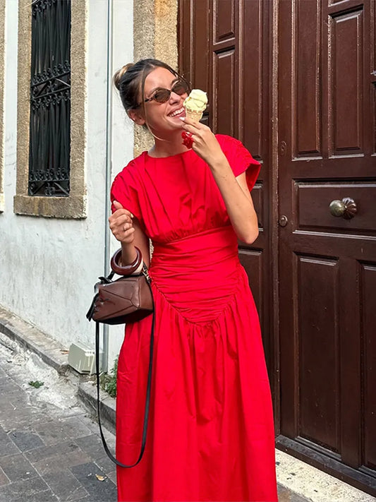 Solid color short sleeved pleated waist dress high waisted bat sleeve short sleeved long skirt