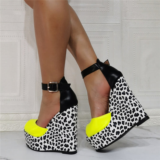 Color Blocking Leopard Print Banquet Oversize Wedge Heel Sexy High-Heeled Sandals